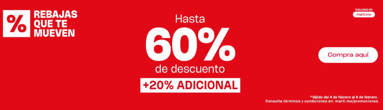 Estoy viendo la promoción de Rebajas que te mueven de la tienda de ropa, calzado, accesorios y equipos deportivos Martí, en la que te ofrecen hasta un 60% de descuento + un 20% de descuento adicional a lo Ya Rebajado; la promoción aplica en productos participantes, es válida solo en su tienda en línea www.marti.mx/rebajas y en su App Martí Go (que puedes descargar desde esa misma página) y estará vigente del 04 al 09 de febrero de 2026.