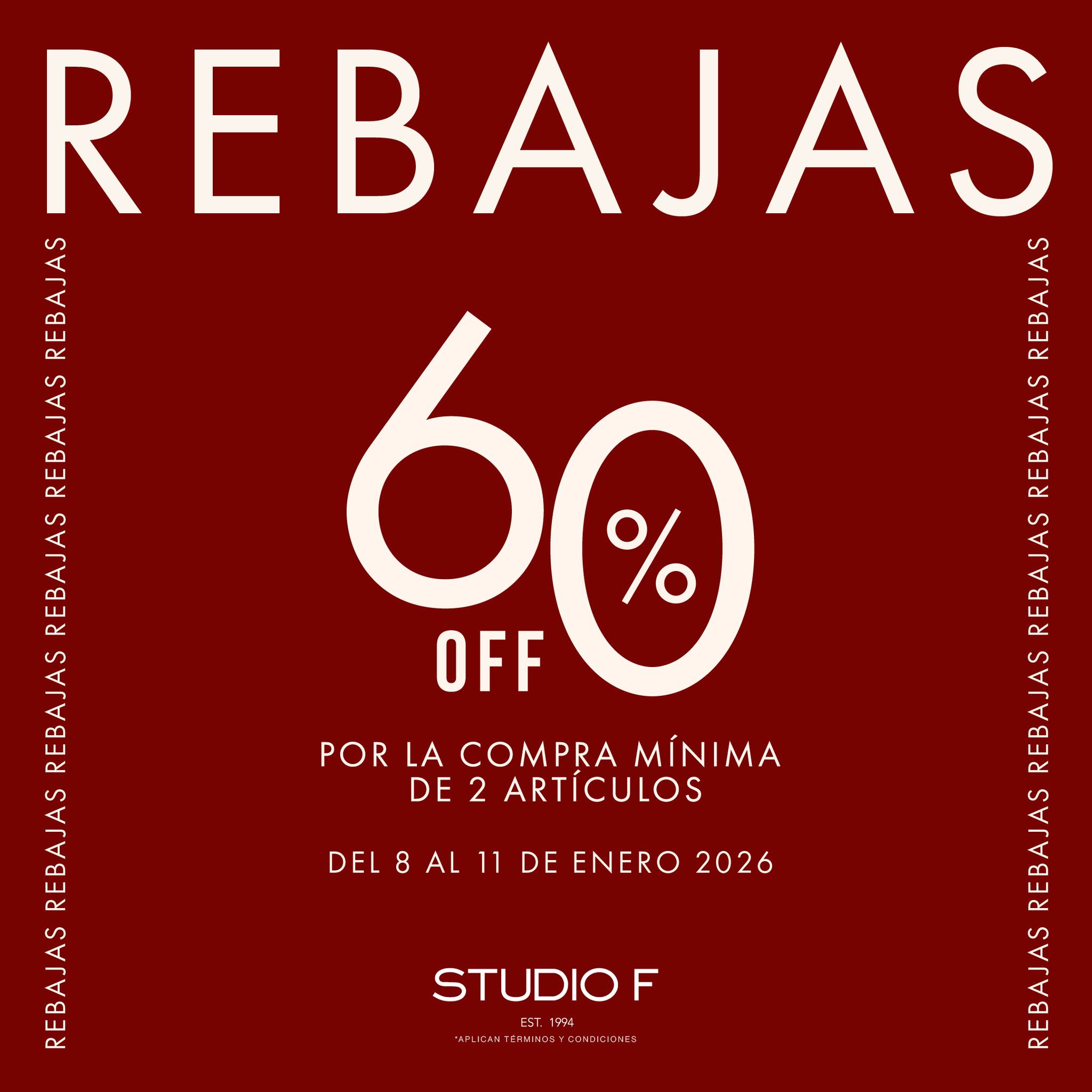 Del jueves 08 al domingo 11 de enero de 2026, estará la promoción de Rebajas de las tiendas de ropa, calzado y complementos de moda Studio F, con la que puedes obtener hasta un 60% de descuento en tus compras por un mínimo de 2 artículos; la promoción aplica en productos seleccionados y es válida en sus sucursales físicas.