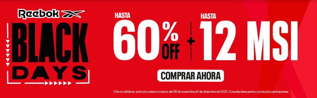 La marca de calzado deportivo, ropa, y accesorios Reebok con su promoción de los Black Days, te ofrece hasta un 60% de descuento en productos seleccionados + hasta 12 Meses sin intereses + Envíos Gratis en tus compras a partir de $1,499.00; la promoción aplica en artículos seleccionados de Calzado, Tenis y Accesorios para toda la familia, estará vigente del 28 de noviembre al 01 de diciembre de 2025 hasta agotar existencias y es válida en su página web www.reebok.mx y en sus sucursales físicas.