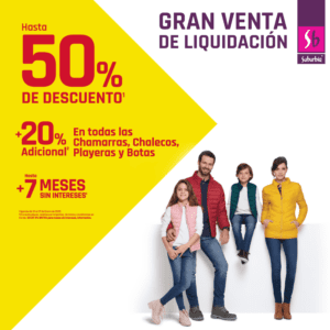Del 01 al 07 de enero de 2020, en Suburbia estará su «Gran Venta de Liquidación», en la que te ofrecen hasta un 50% de descuento + un +20% de descuento adicional en ropa de invierno (chamarras, chalecos, playeras y botas), y hasta 7 meses sin intereses si pagas con tarjetas participantes.