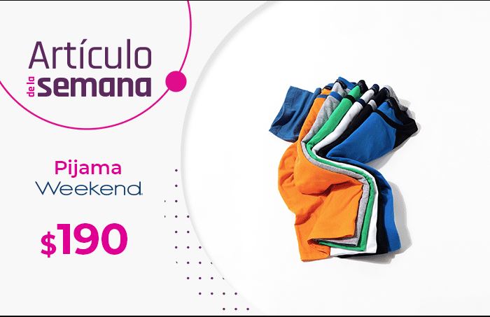Para esta semana (desde hoy martes 01 y hasta el domingo 06 de junio de 2021) el “Artículo de la Semana” de las tiendas departamentales Suburbia corresponde a Pijama de la marca Weekend por $190.00 c/u; la promoción es válida tanto en sus sucursales físicas como en su tienda en línea suburbia.com.