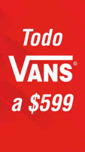 En las tiendas de productos deportivos Sportico hay una promoción, en la que están dando Todo Vans a $599.00 c/u; la promoción aplica en productos de la marca Vans y es válida en su página de Internet www.sportico.com.mx/search?cgid=marca-vans y en sus sucursales físicas.