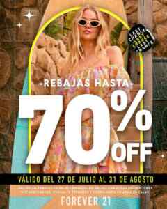 Me estoy enterando que en las tiendas de ropa de moda Forever 21 dieron a conocer la promoción de sus Últimas Rebajas, en la que ahora podrás obtener hasta un 70% de descuento; la promoción aplica en productos seleccionados, es válida en sus sucursales físicas y tiene una vigencia del 27 de julio al 31 de agosto de 2023.