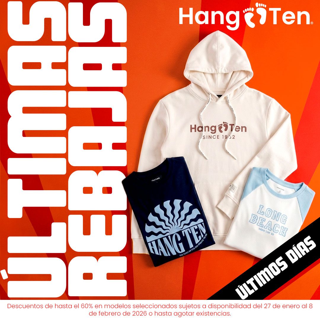 Te comparto la promoción de las Últimas Rebajas de las tiendas de ropa y accesorios de moda Hang Ten, en la que podrás obtener hasta un 60% de descuento + 3 o 6 Meses sin intereses con tarjetas participantes; la promoción aplica en modelos seleccionados, es válida en su tienda en línea http://hangten.com.mx/ y en sus sucursales físicas y estará vigente del 27 de enero al 08 de febrero de 2026 o hasta agotar existencias.