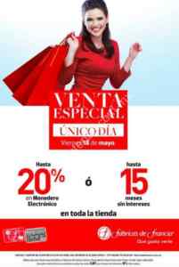 Me adelanto para decirles que el día de mañana habrá Venta Especial en Fábricas de Francia. Encontrarán hasta 20% de descuento en Monedero Electrónico, o hasta 15 meses sin intereses en todo a la tienda.