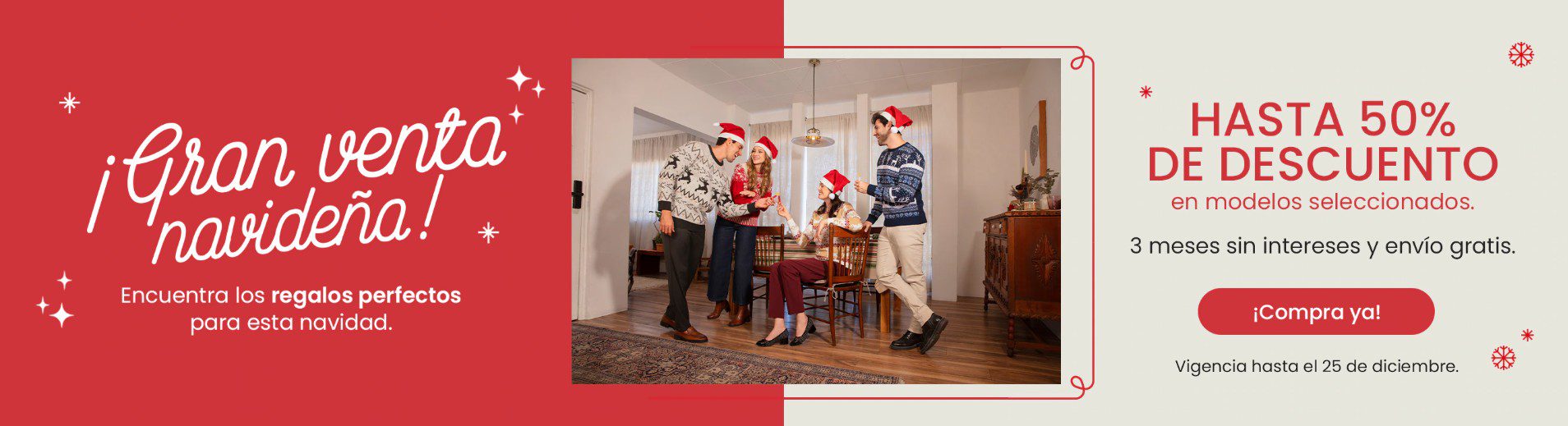 Hasta el 25 de diciembre de 2025, estará la Gran Venta Navideña de la marca de calzado Flexi, en la que están dando hasta un 50% de descuento en productos seleccionados + Envío Gratis + hasta 3 Meses sin intereses; la promoción es válida solo en su sitio de Internet www.flexi.com.mx/es/.