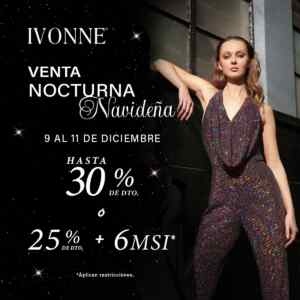Desde hoy viernes 09 y hasta el domingo 11 de diciembre de 2022, en las tiendas de ropa para mujeres Ivonne estará su Venta Nocturna Navideña, en la que te estarán dando hasta un 30% de descuento ó un 25% de descuento + 6 Meses sin intereses; la promoción es válida en sus sucursales físicas.
