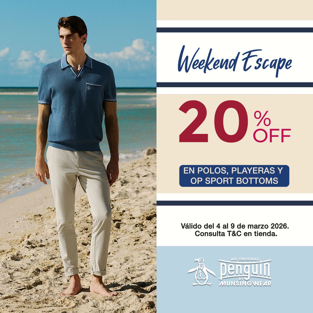 Te comento que en la tienda de ropa, calzado y gafas de moda Original Penguin con su promoción Weekend Escape, están dando un 20% de descuento en Polos, Playeras y OP Sports Bottoms; la promoción estará vigente del 04 al 09 de marzo de 2026 hasta agotar existencias y aplica exclusivamente en sus sucursales físicas.
