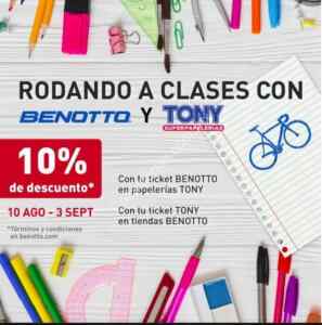 Les comento que a partir del jueves en bicicletas Benotto podrás obtener 10% de descuento al presentar tu ticket de Papelerías Tony, así como en Papelerías Tony también podrás recibir este descuento si presentas tu ticket de Benotto. En ninguna de las dos tiendas se aceptan compras por mayoreo ni aplica para artículos ya en oferta. Pueden pagar en efectivo o con tarjetas de débito y crédito, excepto con American Express, y en Benotto pueden tener 6 meses sin intereses, excepto con Banamex.