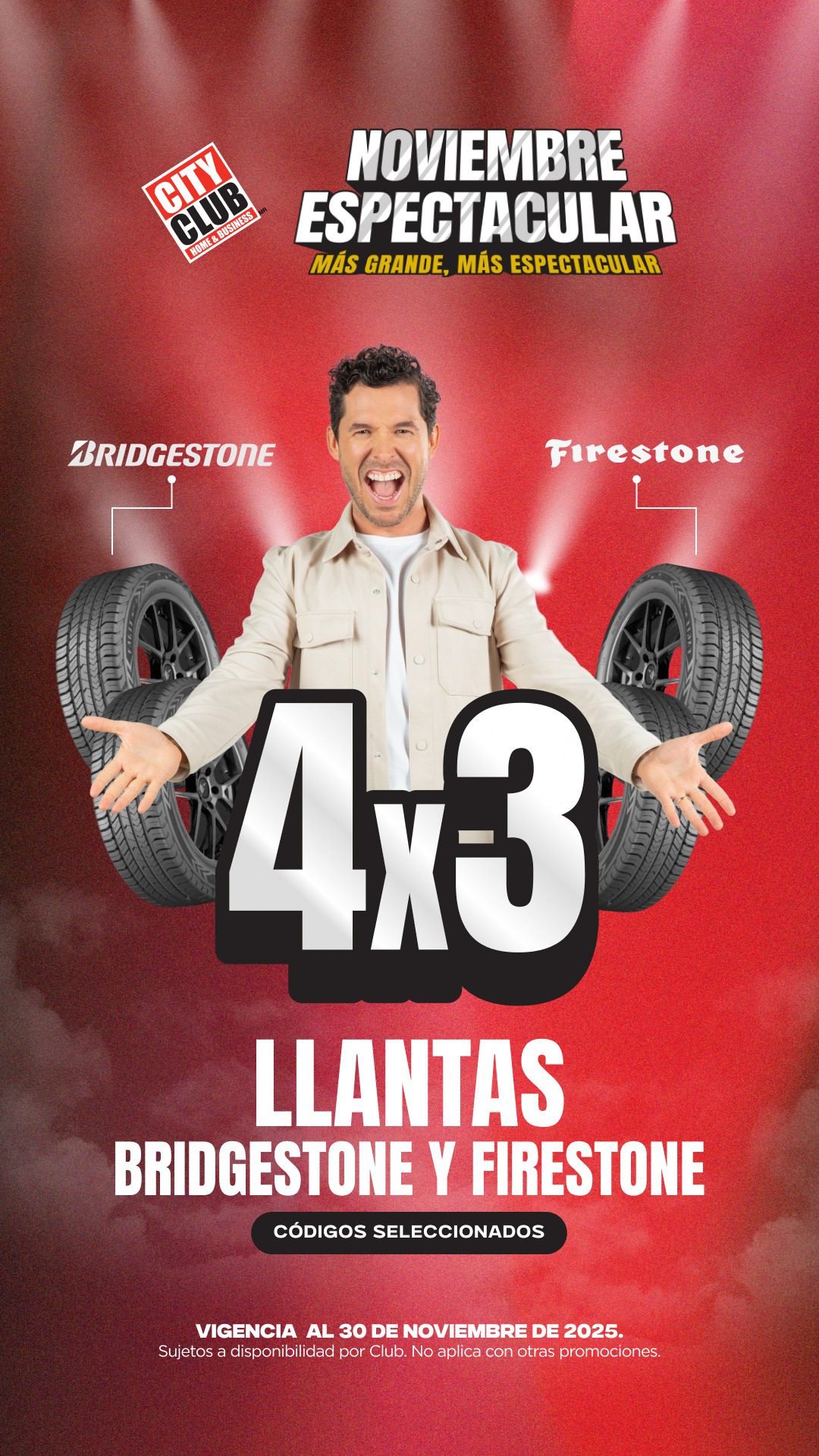 Desde el viernes 01 y hasta el sábado 30 de noviembre de 2025, en los clubes de precios City Club con su promoción Noviembre Espectacular, te ofrecen un 4×3 en Llantas Bridgestone y Firestone, y en la compra de tu 4×3, recibirás la Instalación y Balanceo Gratis durante Noviembre; la promoción aplica en códigos seleccionados, es válida en sus clubes físicos participantes.