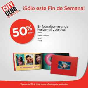 City Club ofrece su álbum de fotos grande, ya sea vertical u horizontal con un 50% de descuento. El último día es hoy, era valido todo el fin de semana pero a penas me entere hoy jajajajajuaja