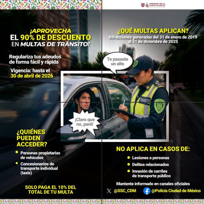 El Sistema de Consulta de Contribuyentes (SCC) y la Policía de la CDMX, con su programa ¡Que no te multen…dos veces!, están ofreciendo un 90% de descuento en Multas de Tránsito; el programa aplica para Infracciones generadas del 31 de enero de 2019 al 31 de diciembre de 2025, es válido para Personas Propietarias de Vehículos y Concesionarios de Transporte Individual (taxis), y estará vigente hasta el 30 de abril de 2026.