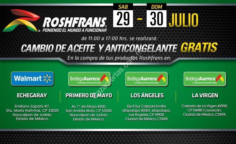 En tiendas Bodega Aurrerá y Walmart participantes hoy sábado 29 y domingo 30 de julio estarán haciendo cambios de aceite y anticongelante gratis, nada más hay que comprar el aceite y anticongelante de la marca Roshfrans que quieran que le pongan en la tienda. Estas son las tiendas participantes: