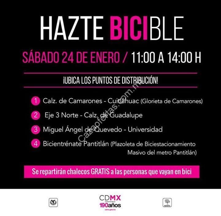 El Gobierno del DF tiene hoy la campaña Hazte BICIble, con la que va a estar regalando chalecos reflejantes a todas las personas que vayan en bicicleta a los centros de distribución. Los puntos son: