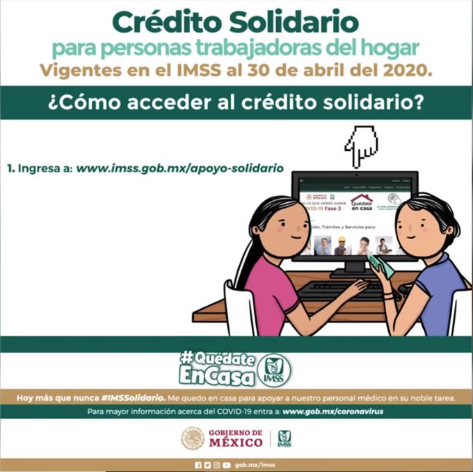 Les comparto que el Gobierno de la República para apoyar por la contingencia del Covid-19, está ofreciendo su crédito «Apoyo Solidario a la Palabra» para personas Trabajadoras del Hogar que estén vigentes en el IMSS al 30 de abril de 2020; sólo deben ingresar a la página www.imss.gob.mx/apoyo-solidario y registrar sus datos (CURP, teléfono, nombre completo, institución bancaria, cuenta Clabe y correo electrónico) y si son candidatas, recibirán el apoyo por $25,000.00 en su cuenta bancaria.