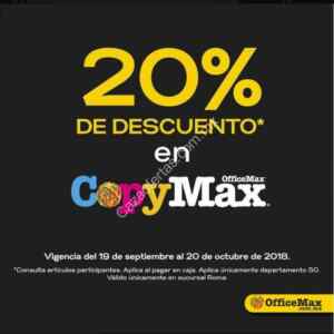 Office Max tiene promoción del 20% de descuento en Copy Max en su sucursal de La Roma por inauguración. Esta promoción estará vigente del 19 de septiembre al 20 de octubre del 2018. El descuento te lo harán válido al pagar en caja. Pregunta en la sucursal qué productos o servicios participan.