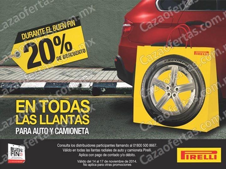 La marca de neumáticos Pirelli también tiene lista su promoción del Buen Fin, en esta ocasión está dando a los consumidores un 20% de descuento en la compra de cualquiera de las llantas para auto o camioneta de venta en los distribuidores autorizados. Para conocer existencia de llantas y la red de distribuidores autorizados Pirelli llamar al 01 800 500 8667.