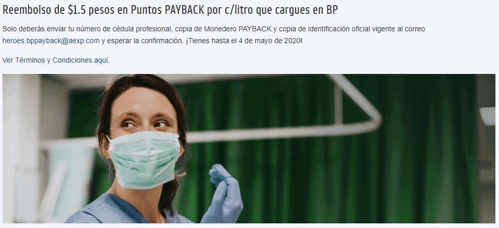 Les comparto que en BP Gasolineras con su promoción «Energía para Nuestros Héroes» les darán una bonificación de 15 puntos Payback (equivalentes a $1.50) por cada litro completo de combustible que compres en sus gasolineras deslizando tu monedero Payback; la promoción aplica para profesionales de la Salud (médicos, enfermeros y residentes) que envíen al correo electrónico heroes.bppayback@aexp.com el número de su cédula profesional, copia de su Monedero PAYBACK y copia de una identificación oficial vigente y te enviarán un correo de confirmación confirmando el beneficio. La promoción estará vigente hasta el 06 de mayo de 2020 (deberás registrarte como máximo el 04 de mayo).