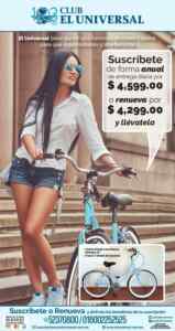 Te comparto que el diario El Universal te regala una bicicleta clásica si te suscribes de forma anual de entrega diaria por $4,599 o renuevas tu suscripción por $4,299; puedes obtener 6 y 12 meses sin intereses si pagas con tarjetas participantes. Disfruta de los beneficios de tu suscripción.