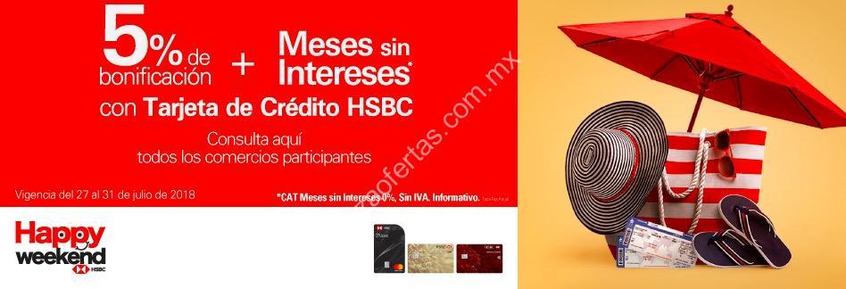 Si cuentan con Tarjeta de Crédito HSBC les comento que este fin de semana y lo que resta del mes estará la promoción Happy Weekend para que se lleven 5% de bonificación + Meses Sin Intereses al pagar con la tarjeta todas sus compras. Esta promoción estará vigente a partir del viernes 27 al martes 31 de julio de 2018.