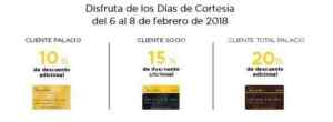 Ahorita hay promoción Días de Cortesía en Palacio de Hierro. Podrán obtener 10% adicional al pagar con Tarjeta Cliente Palacio, 15% adicional con Cliente Socio y 2’0% adicional con Cliente Total Palacio. Además les comento que estas tarjetas, al igual que otras departamentales, no tienen costo de anualidad.