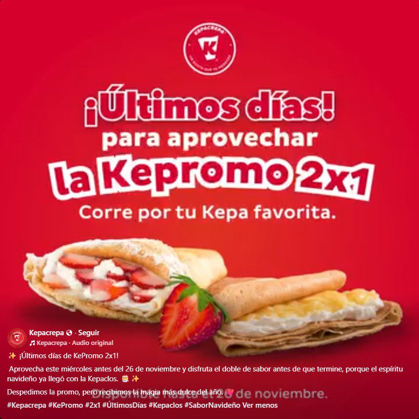 La cadena de restaurantes Kepacrepa, anunciaron su promoción KePromo 2×1, en la que te están ofreciendo un 2×1 en Crepas; la promoción aplica en productos participantes, es válida en sus sucursales físicas y estará vigente hasta el 26 de noviembre de 2025.