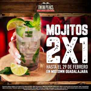 La cadena de restaurantes Twin Peaks anunció su promoción ¡Dos Mojitos son Mejor que Uno!, con la que te están ofreciendo un 2×1 en Mojitos; la promoción aplica solo para consumos dentro del restaurante, es válida exclusivamente en Twin Peaks Midtown Guadalajara y estará vigente hasta mañana jueves 29 de febrero de 2024.