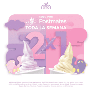 Durante esta semana Moyo Frozen Yogurt tiene una promoción en la que están ofreciendo sus helados al 2 X 1, (no aplica en cono ni en litros) si realizas tu pedido por Postmates; y tiene un vigencia del 26 de agosto al 01 de septiembre de 2019.