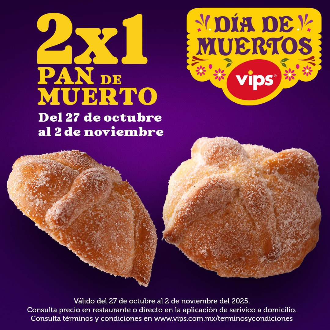 Del lunes 27 de octubre y hasta el domingo 02 de noviembre de 2025, desde la apertura y hasta el cierre, en los restaurantes Vips estará su promoción Día de Muertos, con la que te darán un 2×1 en Pan de Muerto natural; la oferta es válida para consumo dentro del restaurante, para llevar y en servicio a domicilio en sus sucursales físicas y Aeropuertos (excepto Franquicias y Cancún Zona Hotelera) y a través de Uber Eats, DiDi Food y Rappi.