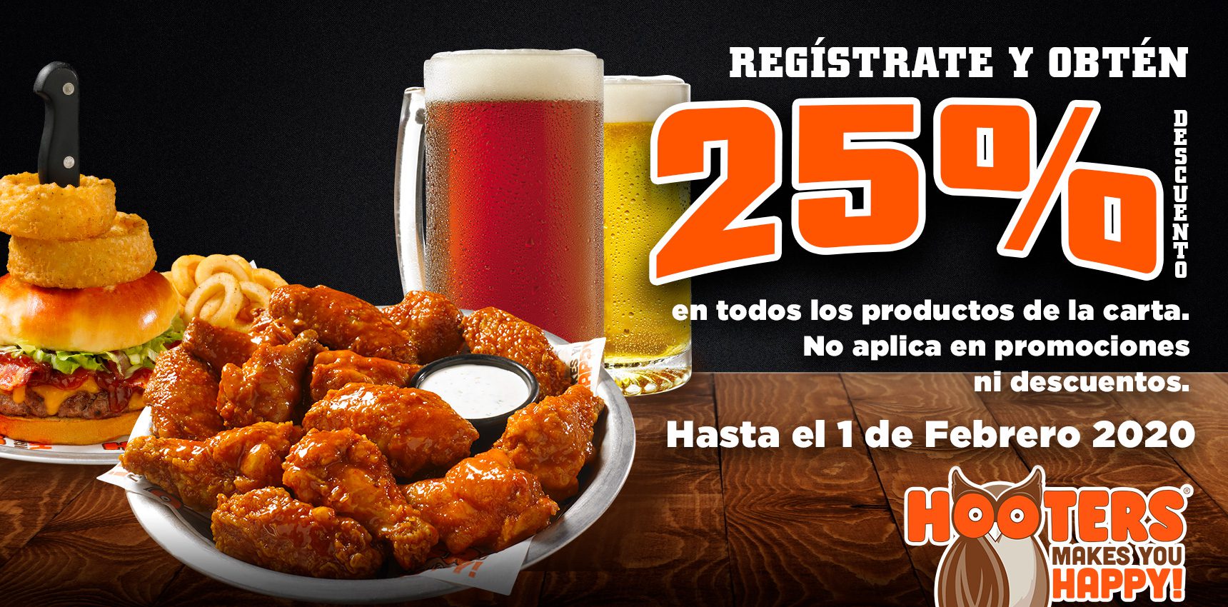 Si estás pensando donde vas a comer, te comento que en Hooters hay una promoción en la que te darán un 25% de descuento en todos los productos de la carta, si te registras en su página web www.hooterspromociones; deberás mostrar en la sucursal de tu preferencia el código de «Registro Exitoso» y estará vigente del del 23 de enero al 01 de febrero de 2020.