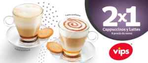 Restaurantes Vips sacó un cupón con el que podrás adquirir al 2×1 tus cafés Capuccinos y Lattes calientes, clásicos o de sabores (sobre precio de menú). No incluye chocolate/moka ni capuccino especial de almendras. La vigencia de la promoción es del 19 de febrero al 30 de abril de 2019 de 7.00 a 23.00 horas. Debes mencionar el cupón al ordenar y presentarlo en la caja. El cupón es personal y válido por sólo una visita. No aplica con otras promociones, cupones, descuentos, servicio a domicilio ni Tarjeta de Lealtad. Válido en todos los Vips de México excepto Vips Torres Bancomer, Vips Aeropuerto AICMX, Vips Aeropuerto Tijuana y Vips Aeropuerto la Paz.