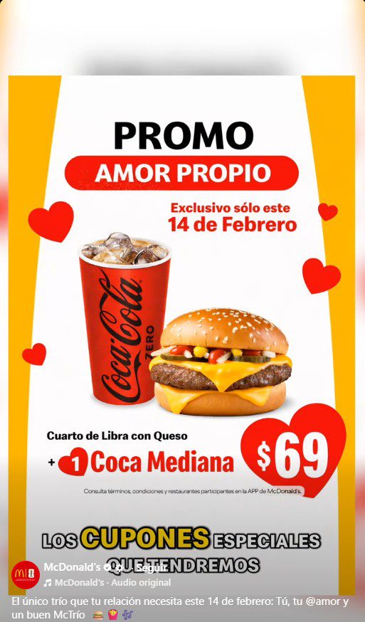 Exclusivamente el sábado 14 de febrero de 2026, estará la promoción de San Valentín 2026 de McDonald’s, con la que podrás adquirir una Cuarto de libra + Coca mediana por $69.00 y más; deberás obtener los Cupones a través de su App (que puedes descargar desde su sitio web: www.mcdonalds.com.mx) y la promoción es válida en sucursales físicas participantes.