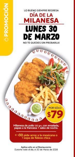 Solo por el día de hoy lunes 30 de marzo de 2026, se está celebrando el Día de la Milanesa, y en Potzollcalli para que lo festejes con ellos, te estarán dando su Milanesa de Pollo (120 g) con Ensalada, Papas a la francesa + Salsa de noche por sólo $79.00; la promoción es válida durante todo el día en sus sucursales físicas (que puedes ubicar en este link: www.potzollcalli.com/sucursales) hasta agotar existencias y aplica solo para consumo en el restaurante.