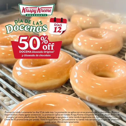 Te recuerdo que hoy jueves 12 de febrero de 2026, es Día de las Docenas en Krispy Kreme, por lo que podrás obtener un 50% de descuento en la Docena Glaseada Original y Glaseada de Chocolate; la promoción aplica solo los días 12 de cada mes y es válida en sus sucursales físicas (incluyendo las que se encuentran en Liverpool) y a través de Delivery: https://www.krispykreme.mx/pidekrispykreme/, Vía WhatsApp (800 00 800 88), Uber Eats, Rappi y DiDi Food.