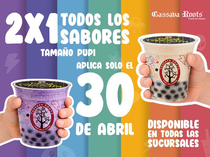 Únicamente por el día de hoy jueves 30 de abril de 2026, estará la promoción ¡Celebra el Día del Niño a lo grande! por el Día del Niño en Cassava Roots, y para que lo festejes con ellos, te darán un 2×1 en todos los sabores tamaño Pupi; la promoción aplica solo en tamaño Pupi y es válida en todas sus sucursales físicas.