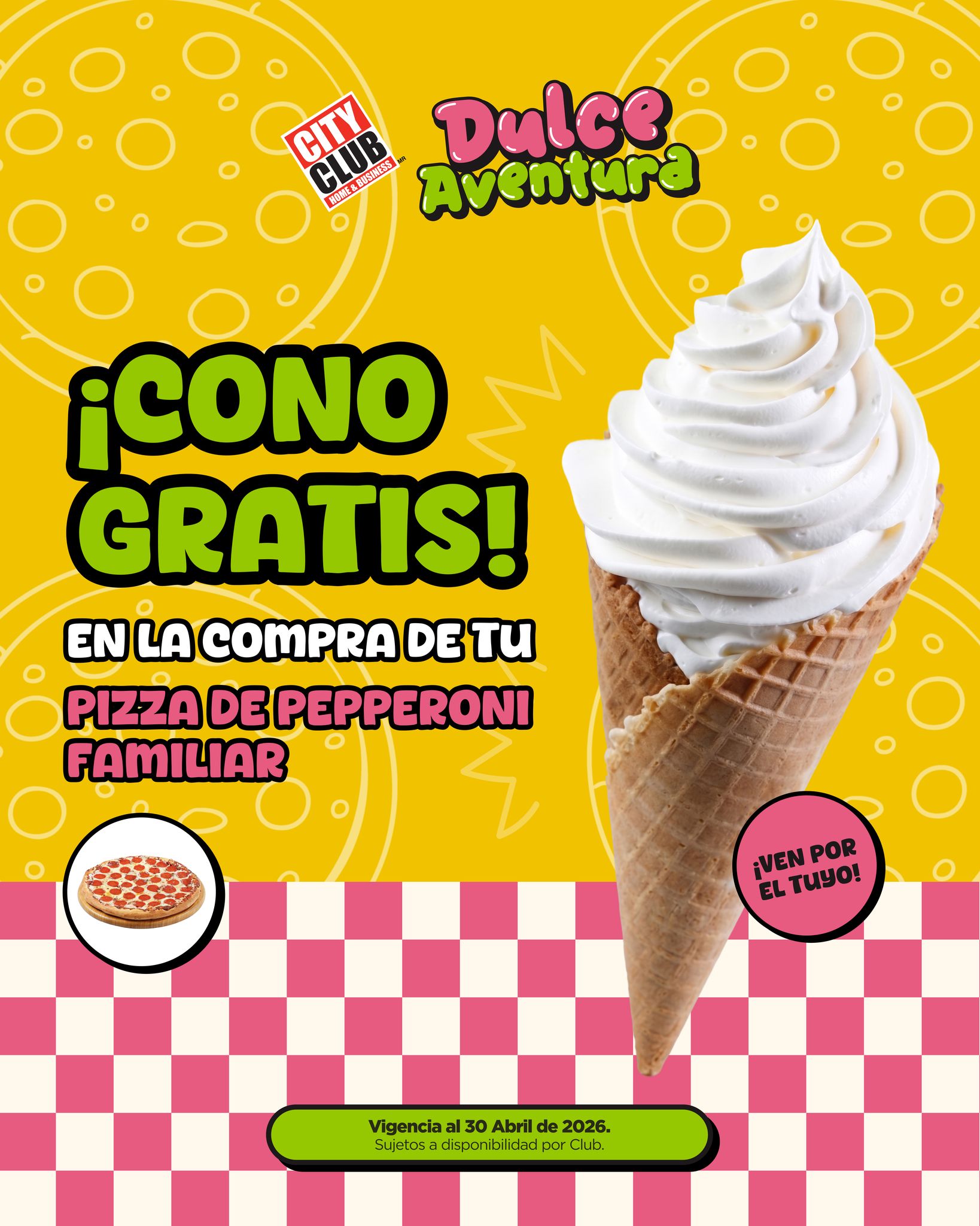 La promoción Dulce Aventura por el Día del Niño de los clubes de precios City Club, te está ofreciendo un Cono de Helado GRATIS si realizas la compra de 1 Pizza Familiar de Pepperoni; la promoción aplica en códigos seleccionados, es válida en sus clubes físicos y solo estará disponible hoy jueves el 30 de abril de 2026.