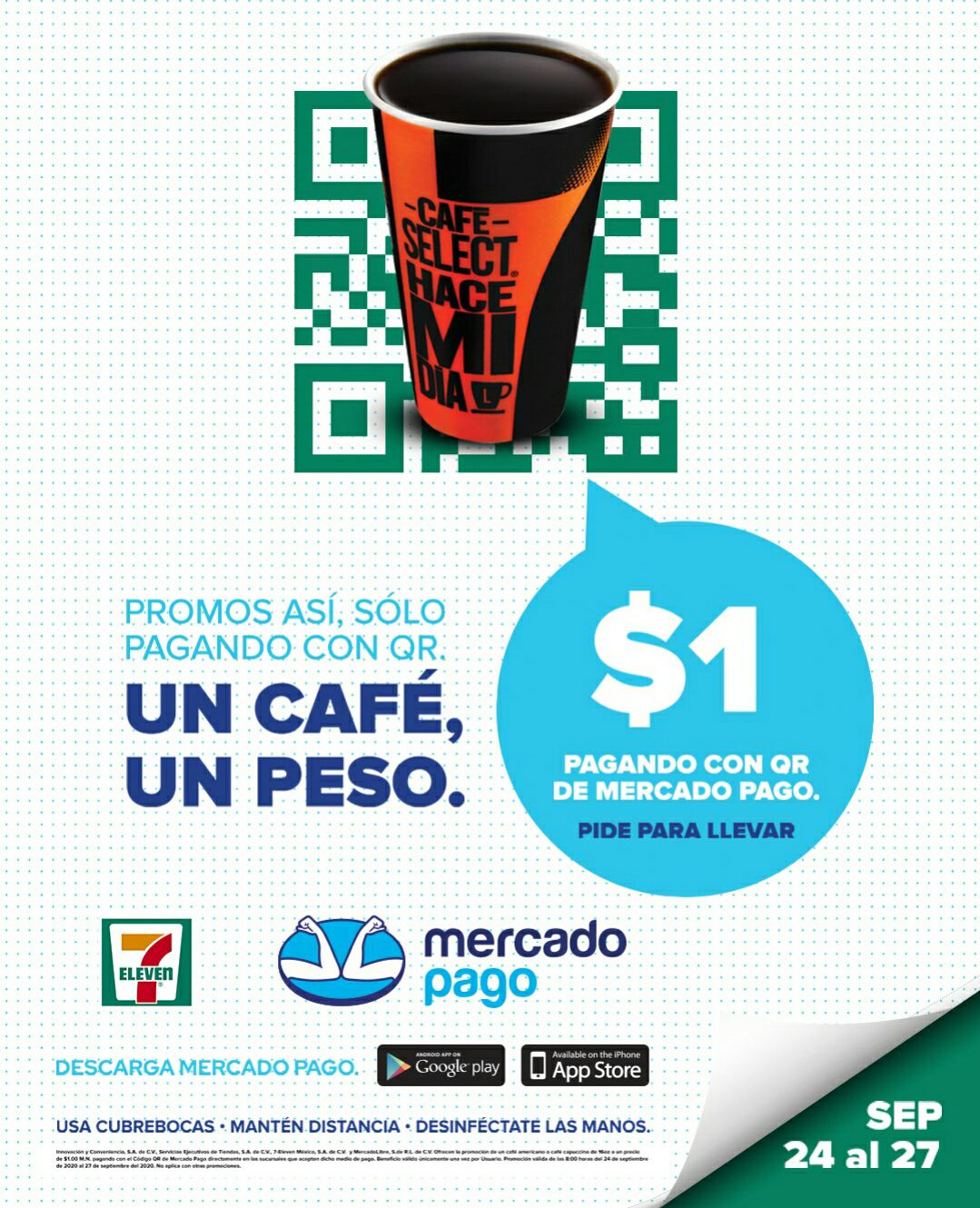 Desde hoy jueves 24 y hasta el domingo 27 de septiembre de 2020, en las tiendas de conveniencia 7-Eleven te darán un Café Americano o Capuccino de 16 oz a $1.00 si pagas mediante código QR de Mercado Pago (puedes descargar la aquí la App de Mercado Pago: para Google Play o para App Store); la promoción es válida en las sucursales que acepten este medio de pago.