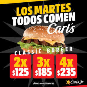 Si estás en busca de opciones para comer, te comento que en Carl’s Jr. con su promoción Los Martes todos Comen con Carl’s, te darán su Classic Burger a un Precio Especial (que depende de la cantidad de hamburguesas que compres); la promoción aplica solo los días Martes, es válida en sus sucursales físicas participantes (no aplica en Aeropuertos) y está sujeta a cambios sin previo aviso por no tener vigencia.
