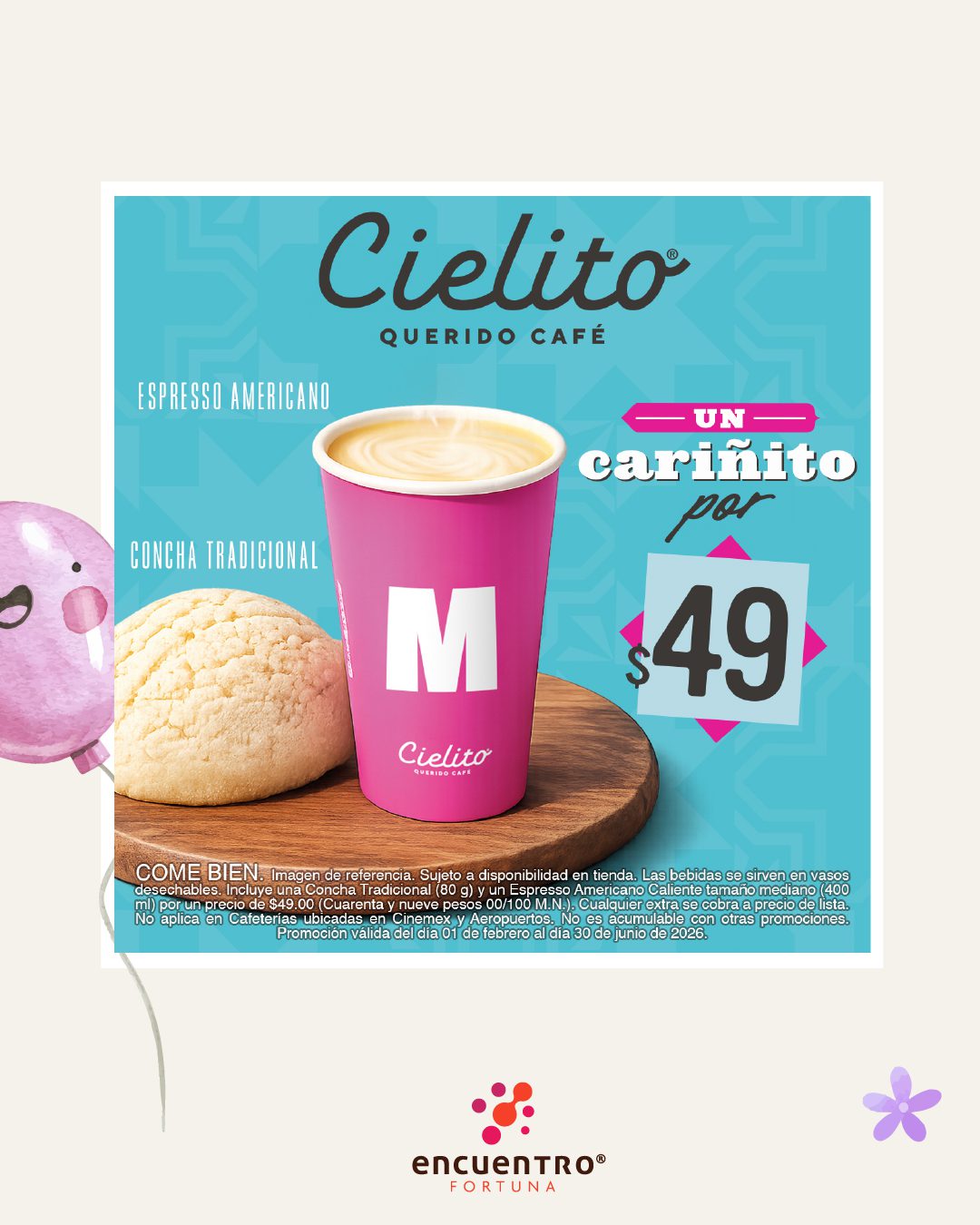 Te comento que en Cielito Querido Café está su promoción Un Cariñito, en la que te darán 1 Espresso Americano caliente de tamaño mediano (400 ml) + 1 Concha tradicional de 80 g por solo $49.00, la promoción aplica solo en estos productos, es válida en sus sucursales físicas (excepto las ubicadas en Cinemex y Aeropuertos) y estará vigente del 01 de febrero al 20 de junio de 2026.