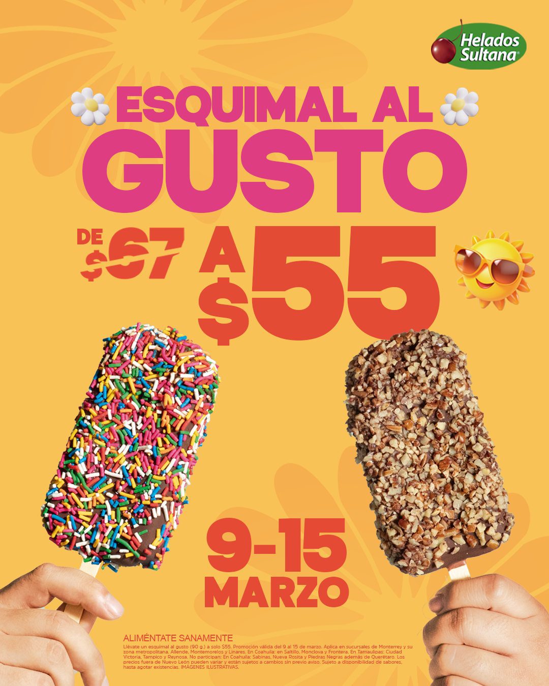 Durante esta semana (del lunes 09 al domingo 15 de marzo de 2026), estará la promoción Olvídate del calor de una manera dulce y deliciosa de Helados Sultana, en la que te ofrecen su Esquimal al Gusto (90 g.) de $67.00 a solo $55.00; la promoción aplica en productos seleccionados, es válida en sus sucursales físicas de Monterrey y su Área Metropolitana: Allende, Montemorelos y Linares, Coahuila: Saltillo, Monclova y Frontera; en Tamaulipas: Ciudad Victoria, Tampico y Reynosa.