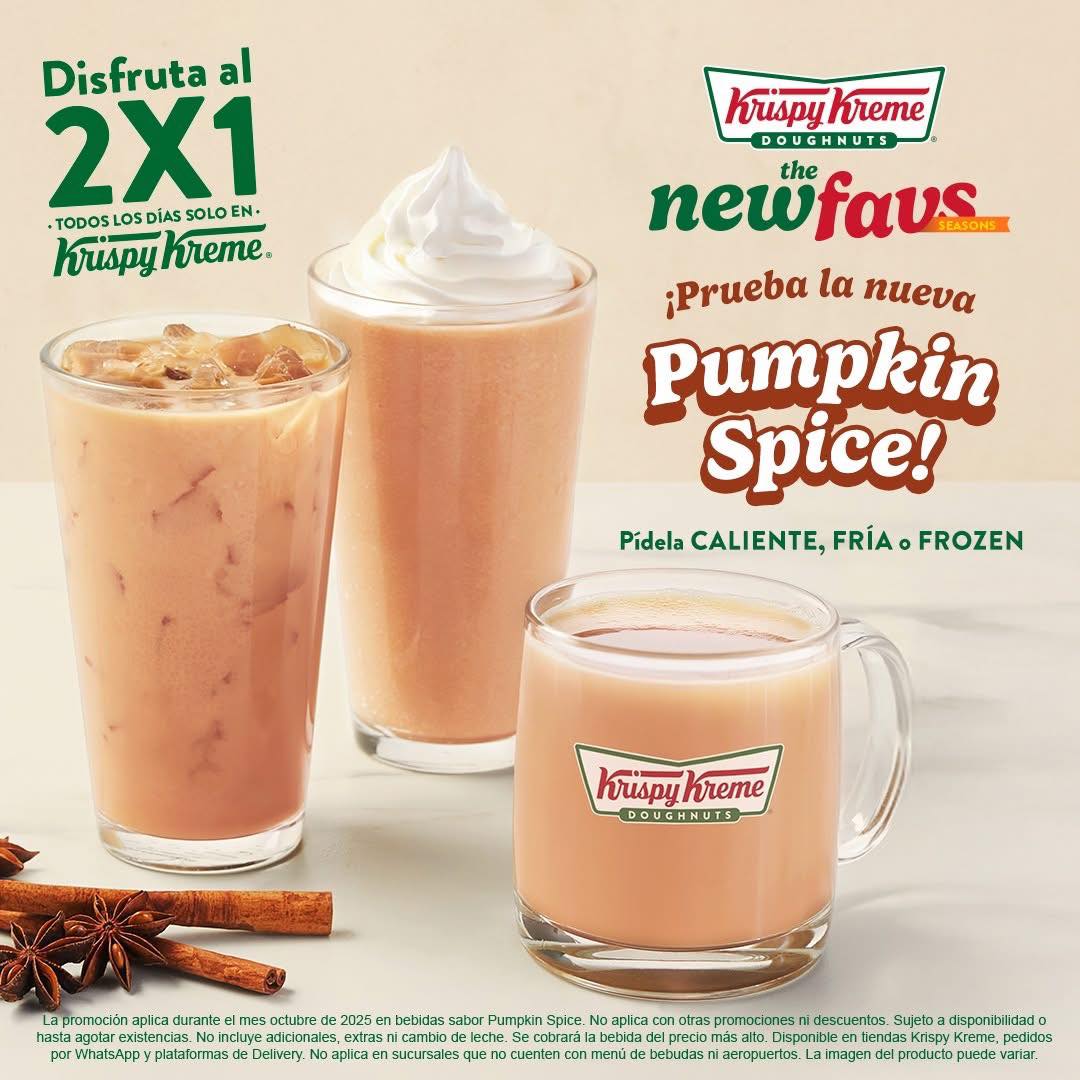 Les comparto la promoción The New Favs de Krispy Kreme, en la que están dando un 2×1 en Bebidas Pumpkin Spice, Caliente, Fría o Frozen (te cobrarán la bebida de mayor precio); la promoción es válida en sus sucursales físicas (excepto sucursales que no cuenten con Menú Bebidas ni Aeropuertos), en pedidos realizados vía WhatsApp al 800 00 800 88 (https://bit.ly/donakremerfb), en su App Krispy Kreme Delivery y a través de Uber Eats y cuenta con una vigencia del 01 al 31 de octubre de 2025.