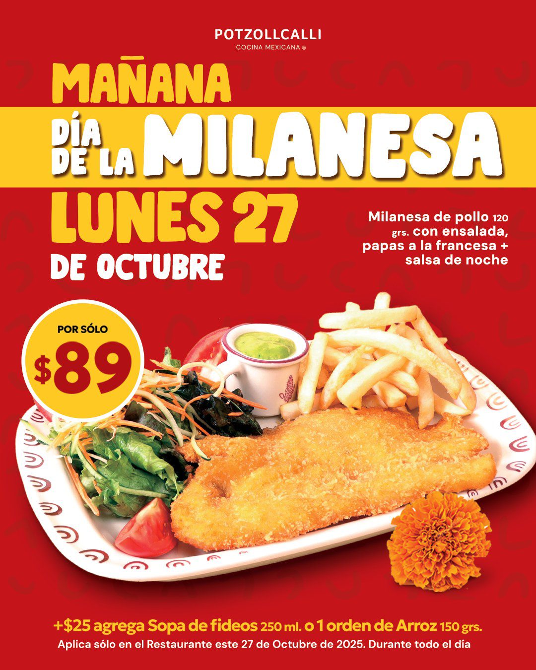 Únicamente por el día de hoy lunes 27 de octubre de 2025, en Potzollcalli estará su promoción por el Día de la Milanesa, con la que te estarán dando 1 Milanesa de pollo de 120 g + Ensalada + Papas a la francesa + Salsa de noche por sólo $89.00; la promoción aplica durante todo el día solo para consumo dentro del restaurante, y es válida en sus sucursales físicas.