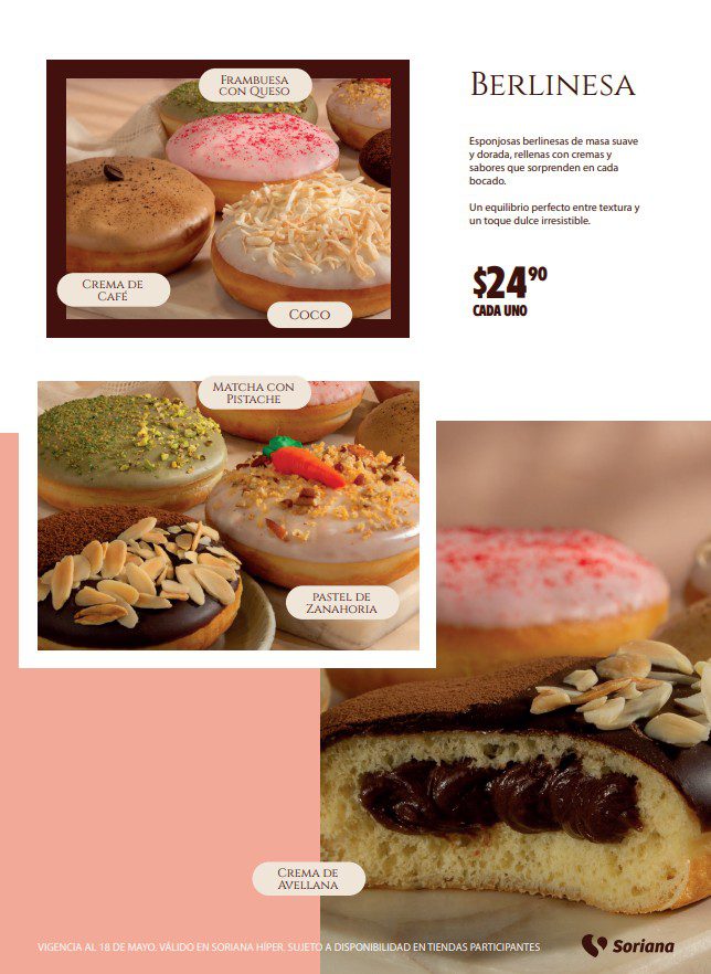 Te comparto el folleto Dulces Momentos de Soriana Híper y Súper, que contiene sus ofertas válidas del 15 de abril al 18 de mayo de 2026 o agotar existencias, y en el que encontrarás Precios especiales; las ofertas son válidas en artículos seleccionados de Panadería y Pastelería y aplican en su tienda en línea soriana.com y en sus sucursales físicas participantes.