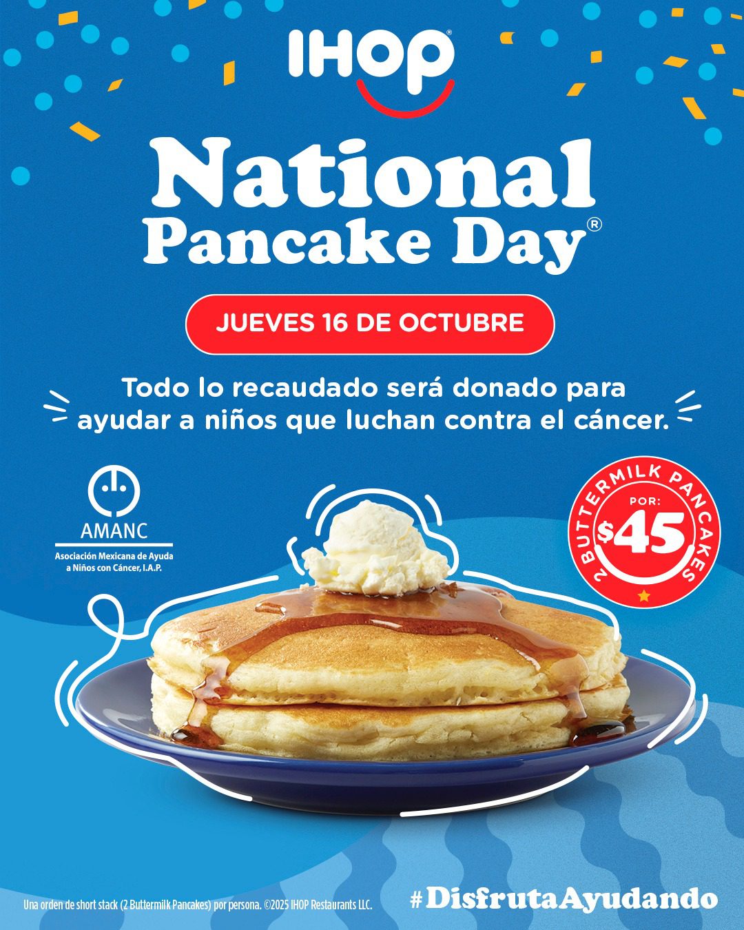 El jueves 16 de octubre de 2025, se celebrará la 12ª edición del National Pancake Day, y en los restaurantes IHOP para que lo festejemos con ellos, nos están ofreciendo 2 Buttermilk Pancakes por sólo $45.00; la promoción será válida para consumo dentro de sus restaurantes en todas sus sucursales; para Servicio a domicilio en: Antenas, CDMX, Félix Cuevas, CDMX, Lindavista, CDMX, Patio Universidad, CDMX, Pedregal, CDMX, Santa Fe, CDMX, Vallejo, CDMX, World Trade Center , CDMX, IKEA Center Oceanía, CDMX, Coapa, CDMX, Tepeyac, CDMX, Galerías Atizapán, Estado de México, Mundo E, Estado de México, Satélite, Estado de México, Cuernavaca, Morelos, La Selva, Morelos, Parque Puebla, Puebla y Mérida, Yucatán. Debes saber que para ayudar a los Niños y Niñas con cáncer, todo lo recaudado será destinado a AMANC y otras asociaciones de ayuda a niños con cáncer.