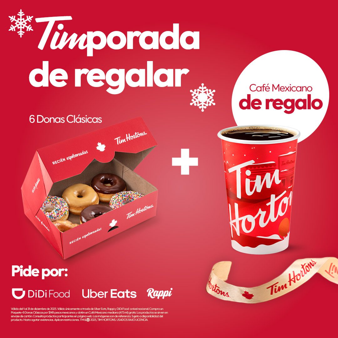 Hasta el 31 de diciembre de 2025, en las cafeterías Tim Hortons con su promoción de Navidad, te darán un Café Mexicano mediano 473 ml GRATIS en la compra de 6 Donas Clásicas; la promoción es válida solo en pedidos realizados a través de DiDi Food, Rappi y Uber Eats.