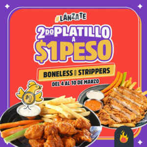 Está de regreso la promoción Lánzate de Las Alitas, en la que te ofrecen que en la compra de 1 platillo de Boneless Personales o Strippers Clásicos a precio regular del menú, te darán el Segundo platillo (de Boneless Personales o Strippers Clásicos) a solo $1.00 (y puedes combinar los platillos); la promoción aplica solo para consumos dentro del comedor, estará vigente del 04 al 10 de marzo de 2024 o hasta agotar existencias en sus sucursales de Nuevo León, Ciudad de México, Estado de México y Jalisco (las puedes ubicar en este link: lasalitas.com/ubicaciones).