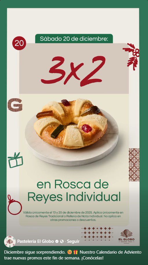 Hace un momento vi que en las pastelerías El Globo, con su promoción Calendario de Adviento por Navidad, te está ofreciendo un 3×2 o 20% de descuento; la promoción aplica según el día en productos participantes, es válida en sus sucursales físicas y cuenta con una vigencia del 19 al 21 de diciembre de 2025 o hasta agotar existencias (la oferta cambia cada día). Estas son sus ofertas: