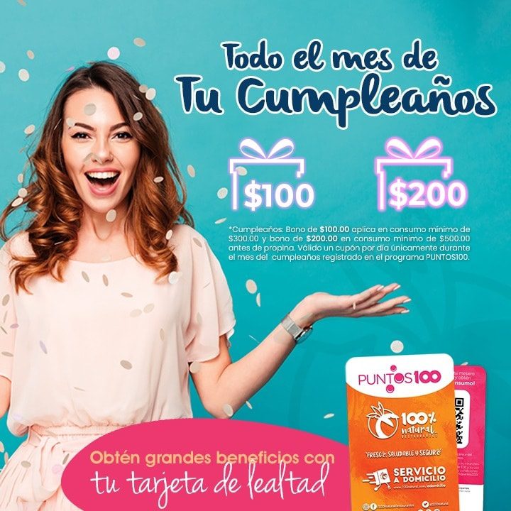 Te comparto la promoción Tu Cumple dura todo el Mes, de los restaurantes 100% Natural, con la te están ofreciendo hasta $200.00 de descuento en el mes de tu cumpleaños (antes de propina); la promoción aplica presentando tu Tarjeta de lealtad Puntos 100 (la puedes obtener en sus sucursales, tiene un costo de $50.00 y te bonifican 100 puntos al registrarla), está limitado a 1 Cupón por día durante el mes de tu cumpleaños, y es válida en sus sucursales físicas.