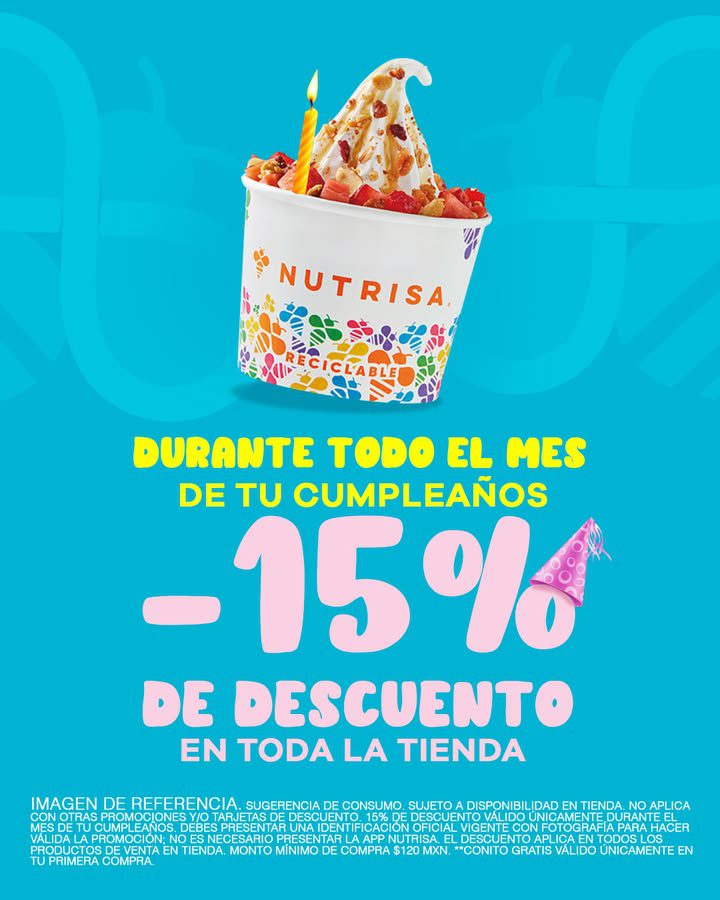 La promoción Tu cumpleaños dura más de las tiendas de helados de yogurt y productos nutricionales Nutrisa, te está ofreciendo un 15% de descuento en toda la tienda y un Conito GRATIS (el conito aplica solo en tu primera compra); la promoción aplica durante todo el mes de tu cumpleaños, en compras por un mínimo de $120.00, deberás presentar una Identificación Oficial vigente con fotografía y es válida en sus sucursales físicas.