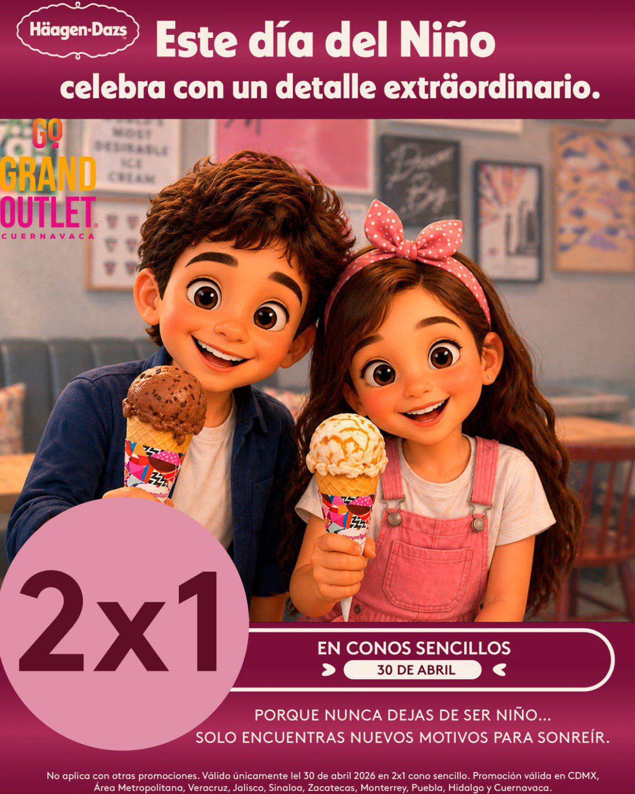 Solo por el día de hoy jueves 30 de abril de 2026, estará la promoción ¡Este Día del Niño se celebra con doble sabor! de las heladerías Häagen-Dazs, en la que te darán un 2×1 en Conos sencillos (en la compra de 1, te darán GRATIS otro cono), la promoción es válida en sus sucursales físicas de la CDMX, Área Metropolitana, Veracruz, Jalisco, Sinaloa, Zacatecas, Monterrey, Puebla, Hidalgo y Cuernavaca.